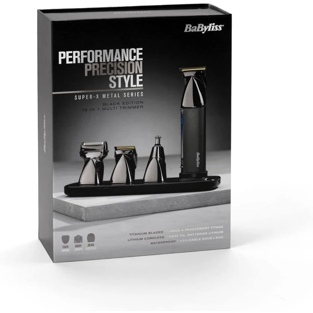 Der BaBylissMEN Super X Metal Series 15-in-1 Multi Trimmer gibt Ihnen die Freiheit, zu trimmen, was Sie wollen und wo Sie wollen. Er ist vollständig kabellos und wasserdicht und bietet somit endlose Möglichkeiten. Bringen Sie sich im Fitnessstudio in Form, geben Sie Ihrem Haar den letzten Schliff vor dem Ausgehen oder nehmen Sie den BaBylissMEN Super X Metal Series 15-in-1 Multitrimmer mit in den Urlaub. Kein Strom mehr da? Mit einer 20-minütigen Aufladung können Sie weitere 40 Minuten trimmen.&Der BaBylissMEN Super X Metal Series 15-in-1 Multi Trimmer sorgt für präzises Schneiden am ganzen Körper. Erstens ist er wasserdicht und kann überallhin mitgenommen werden. Dann verwendet er ein MagFix-System, mit dem Sie die Aufsätze festhalten und schnell auswechseln können. Der BaBylissMEN Super X Metal Series 15-in-1 Multi Trimmer wird mit einer ganzen Reihe von Bart-, Körper- und Augenbrauenkämmen geliefert, die für alle Bereiche geeignet sind. Dann gibt es den Ohr- und Nasentrimmer, der speziell für das sanfte Trimmen in diesen Bereichen entwickelt wurde. Und schließlich ist das ganze Gerät robust mit einem Metallgriff und einem USB-Docking-System. Laden Sie den BaBylissMEN Super X Metal Series 15-in-1, Multi Trimmer, in 3 Stunden voll auf oder laden Sie ihn in 20 Minuten für 40 Minuten bis 5 Stunden Trimmleistung auf.