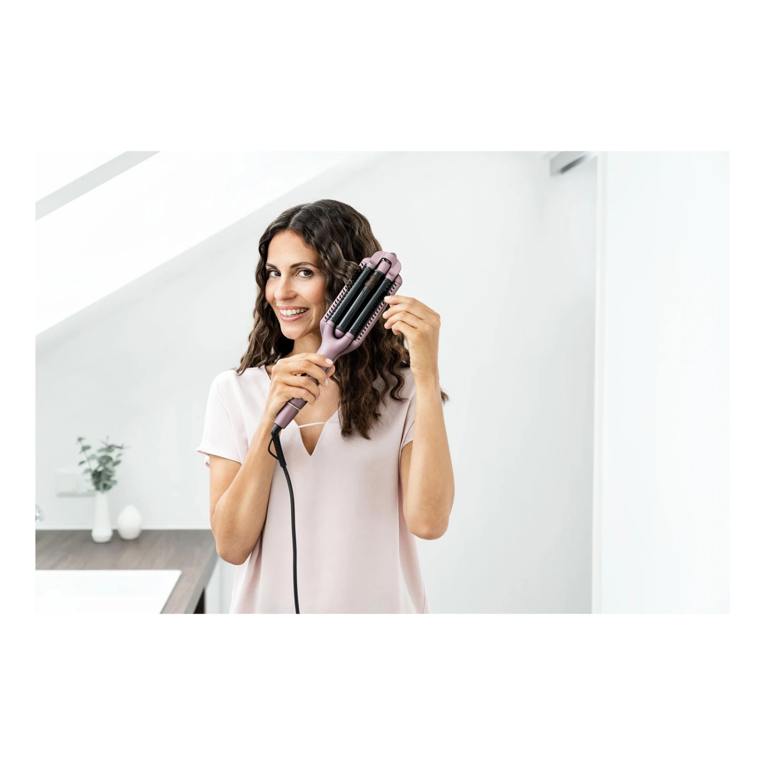 Mit dem 4-in-1 Welleneisen gelingen Beach Waves, natürlichen Wellen, Mermaid Waves oder Wasserwellen im Handumdrehen. Zum Schutz der Haare ist das Welleneisen mit einer Keramik-Keratin Beschichtung ausgestattet.