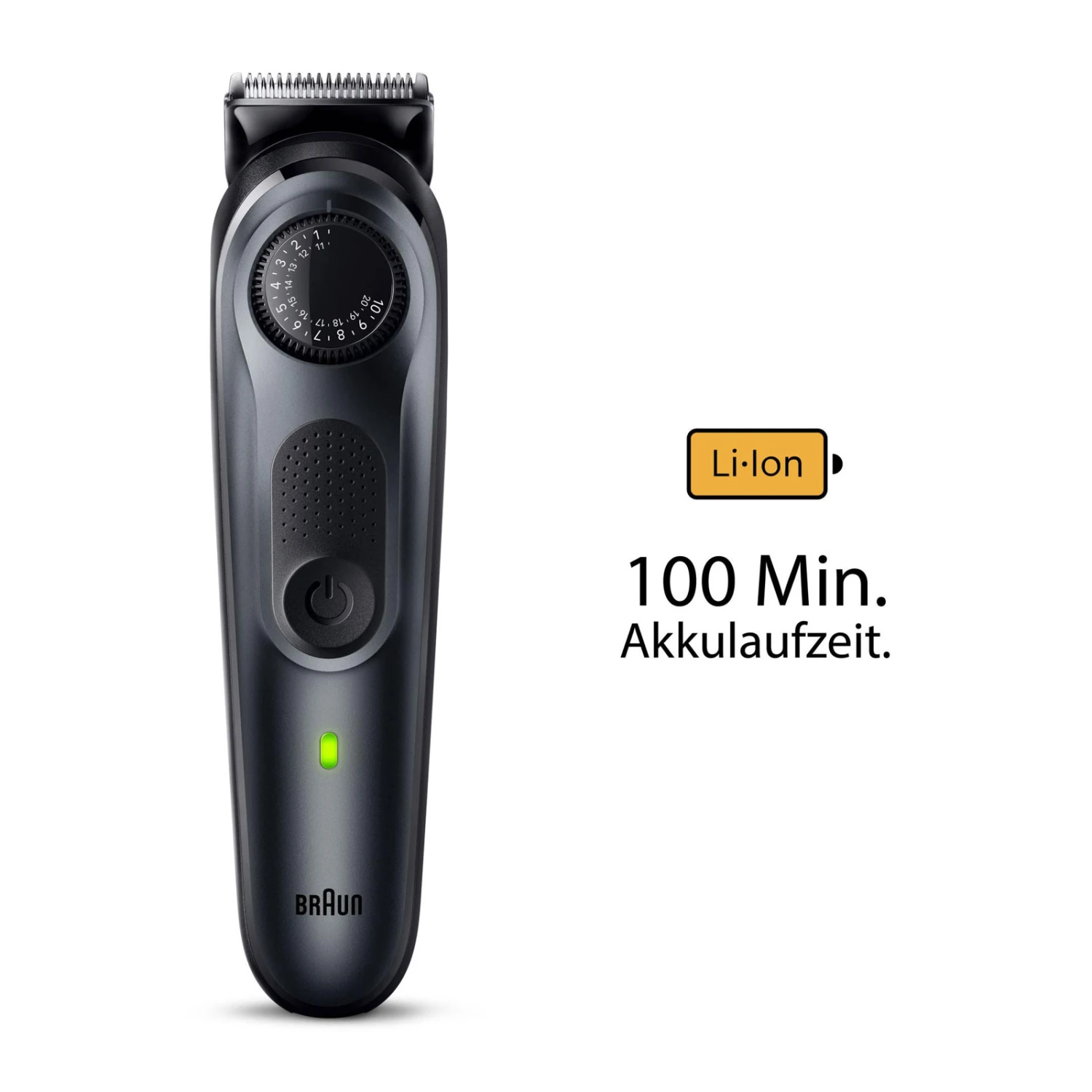| Wählen Sie aus 40 Längeneinstellungen In präzisen 0,5-mm-Schritten mit dem Präzisionsrad. Präzision und 100% Kontrolle leicht gemacht mit dem Braun Barttrimmer 3 |