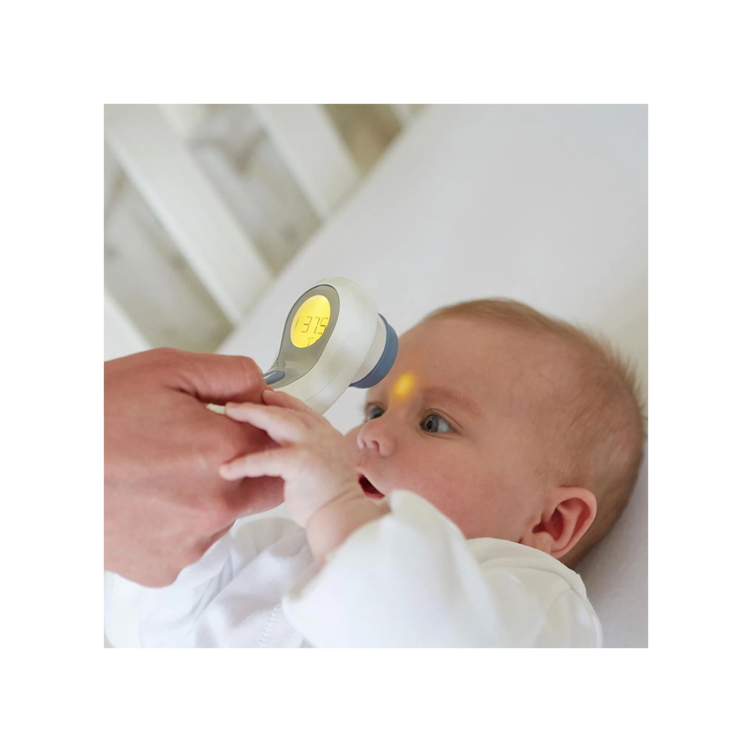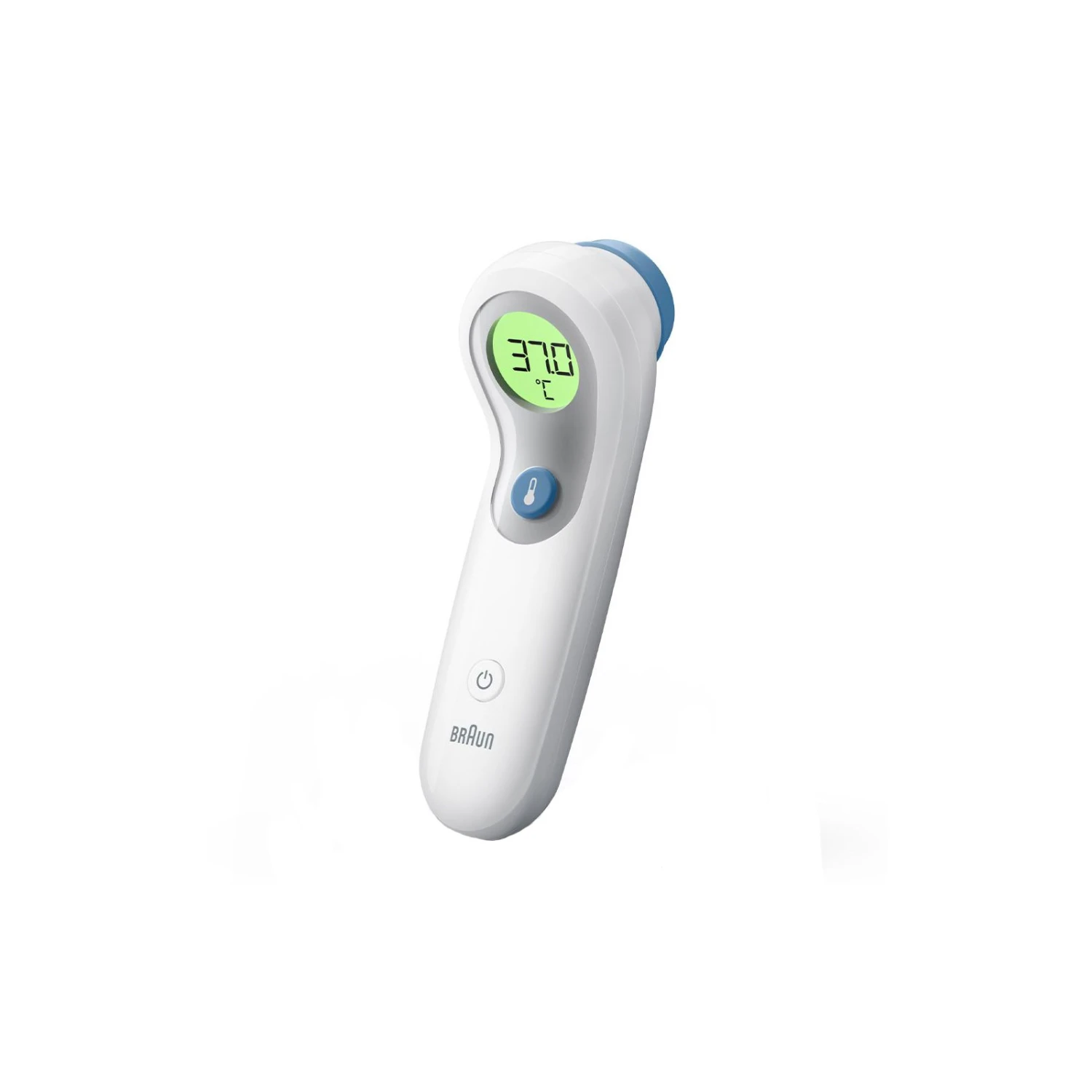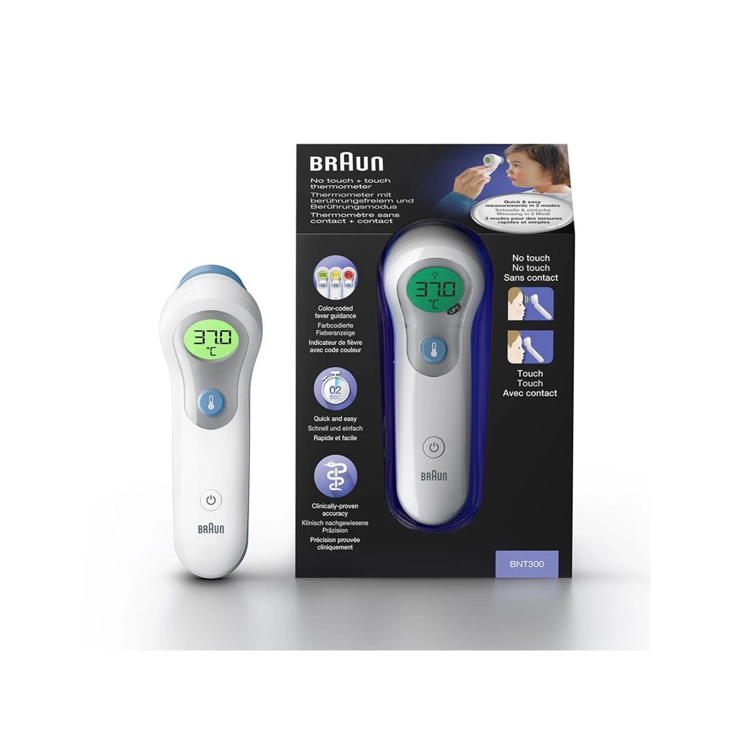 Braun Berührungsfreies + Stirnthermometer BNT300 ist ein elektronisches Stirnthermometer für die Temperaturmessung durch Berührung der Stirn sowie nichtinvasive und berührungsfreie Temperaturmessung. Dieses Thermometer nimmt im Vergleich zu herkömmlichen Stirnthermometern doppelt so viel Wärmestrahlung auf und misst die Temperatur präzise in nur 2 Sekunden. Die farbkodierte Messwertanzeige ändert die Farbe entsprechend der angezeigten Temperatur. Piepton sowie Licht bestätigen die korrekte Positionierung des Thermometers für eine optimale Temperaturmessung.