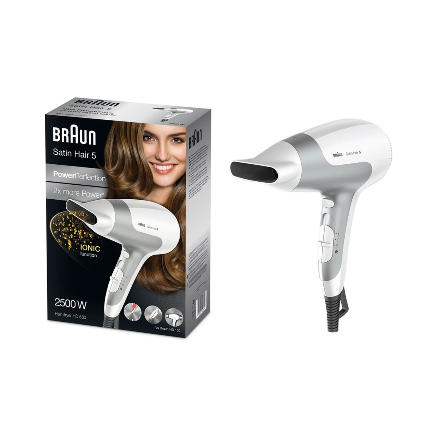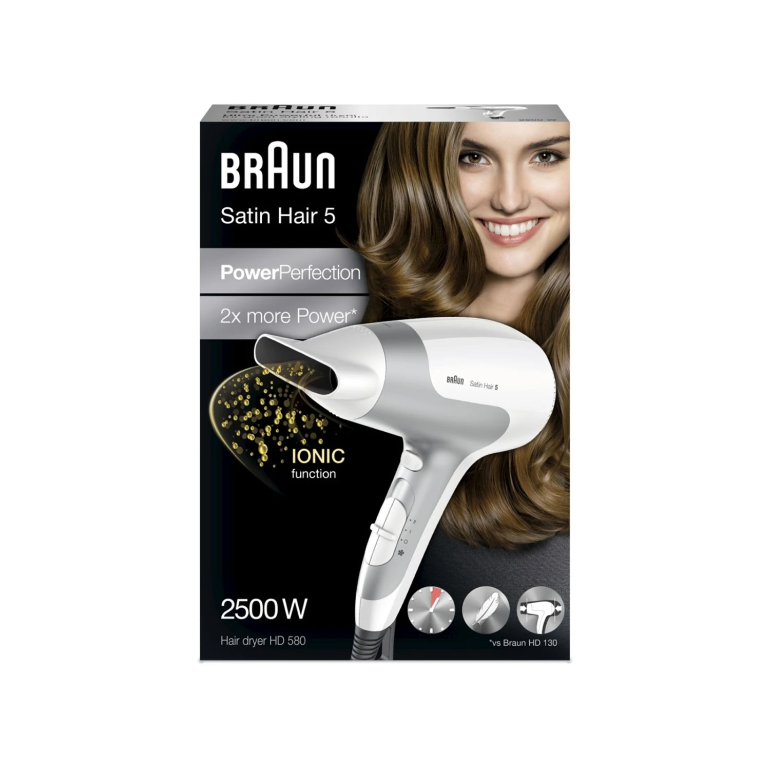 Der Satin Hair 5 Haartrockner, der leistungsstärkste Haartrockner aus dem PowerPerfection-Sortiment, kombiniert optimale Trockentemperaturen mit 2500 Watt Leistung. Da er einfach zu benutzen und ergonomisch ist, eignet er sich perfekt, um Ihr Haar schneller und gründlicher zu trocknen. Aufgrund seines äußerst geringen Gewichts ist das kompakte Gerät ideal für den Gebrauch zu Hause und unterwegs.