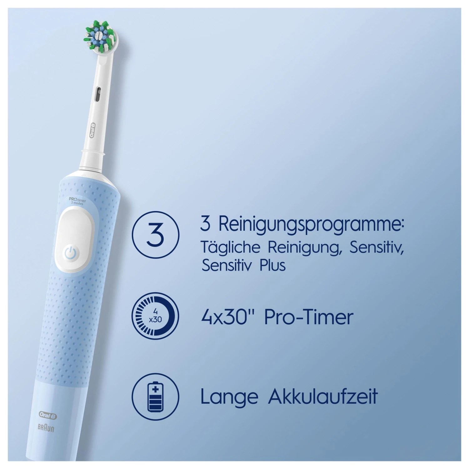 Die Oral-B Vitality Pro wiederaufladbare elektrische Zahnbürste bietet eine klinisch bestätigte überlegene Reinigung im Vergleich zu herkömmlichen Handzahnbürsten. Die Vitality Pro verfügt über 3 Putzprogramme: Tägliche Reinigung, Sensitiv und Sensitiv-Plus für ein erstaunlich sanftes Zahnputzerlebnis. Der Timer im Handstück unterstützt Sie dabei, die vom Zahnarzt empfohlene Putzzeit von 2 Minuten einzuhalten. Oral-B – die Zahnbürstenmarke, die Zahnärzte weltweit am häufigsten selbst verwenden.