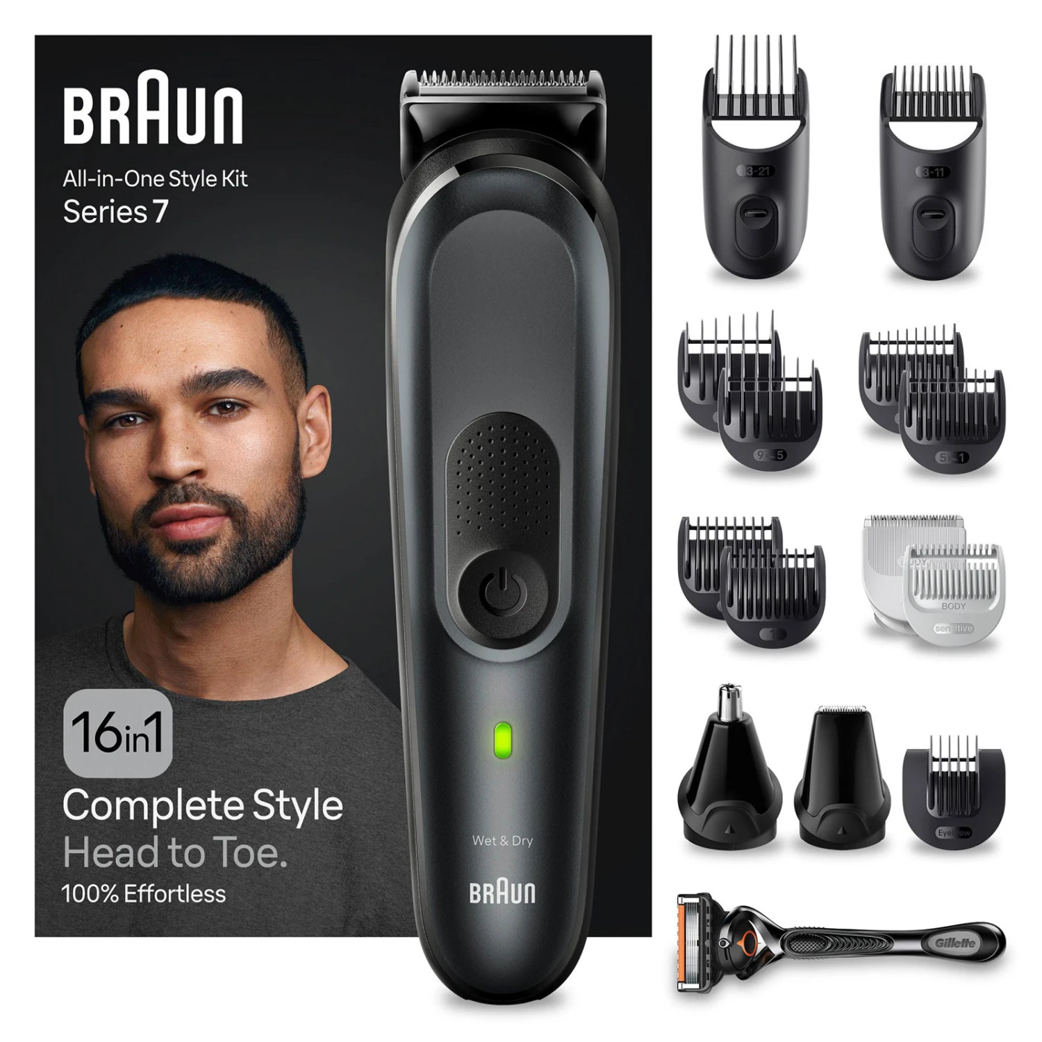 1x Trimmer, 1x Metall-Trimmeraufsatz, 1x Bodygroomer-Aufsatz, 1x Detail-Trimmerkopf, 1x Trimmeraufsatz für Ohren- und Nasenhaare, 1x Verschiebbarer Bartkammaufsatz (3 – 11 mm), 1x Verschiebbarer Haarkammaufsatz (13 – 21 mm), 1x Fester Standard-Kammaufsatz (1 mm), 1x Fester Standard-Kammaufsatz (2 mm), 1x Bartkammaufsatz, 1x Haarkammaufsatz, 1x Sensitiv-Kammaufsatz, 1x Augenbrauen-Kammaufsatz, 1x Gillette ProGlide Rasierer, 1x Gillette ProGlide Ersatzklinge, 1x Reinigungsbürste, 1x Ladestation, 1x Organizer-Etui