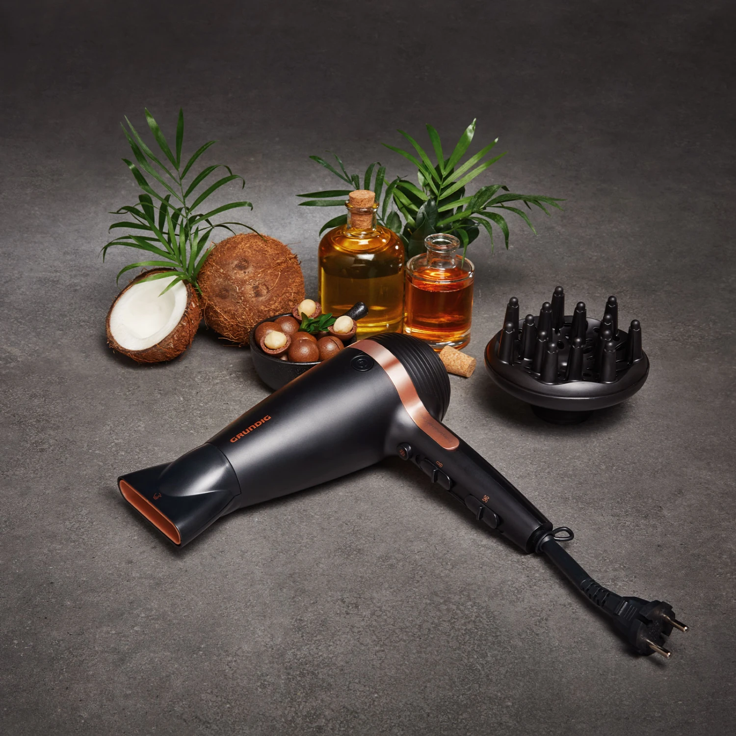 Während Kokosöl die Feuchtigkeit der Haare schützt, erhält Macademia den Glanz und die Weichheit. Die Oberfläche der CoolTouch-Stylingdüse wird während des Betriebs nicht überhitzt. Der abnehmbare Volumen-Diffusor bringt natürlichen Schwung in gewelltes Haar, Volumen in feines Haar und sorgt für Stand am Haaransatz. Das Lufteinlassgitter ist ebenfalls abnehmbar. Das Kabel ist 1,8 m lang; inkl. Aufhängeöse.
