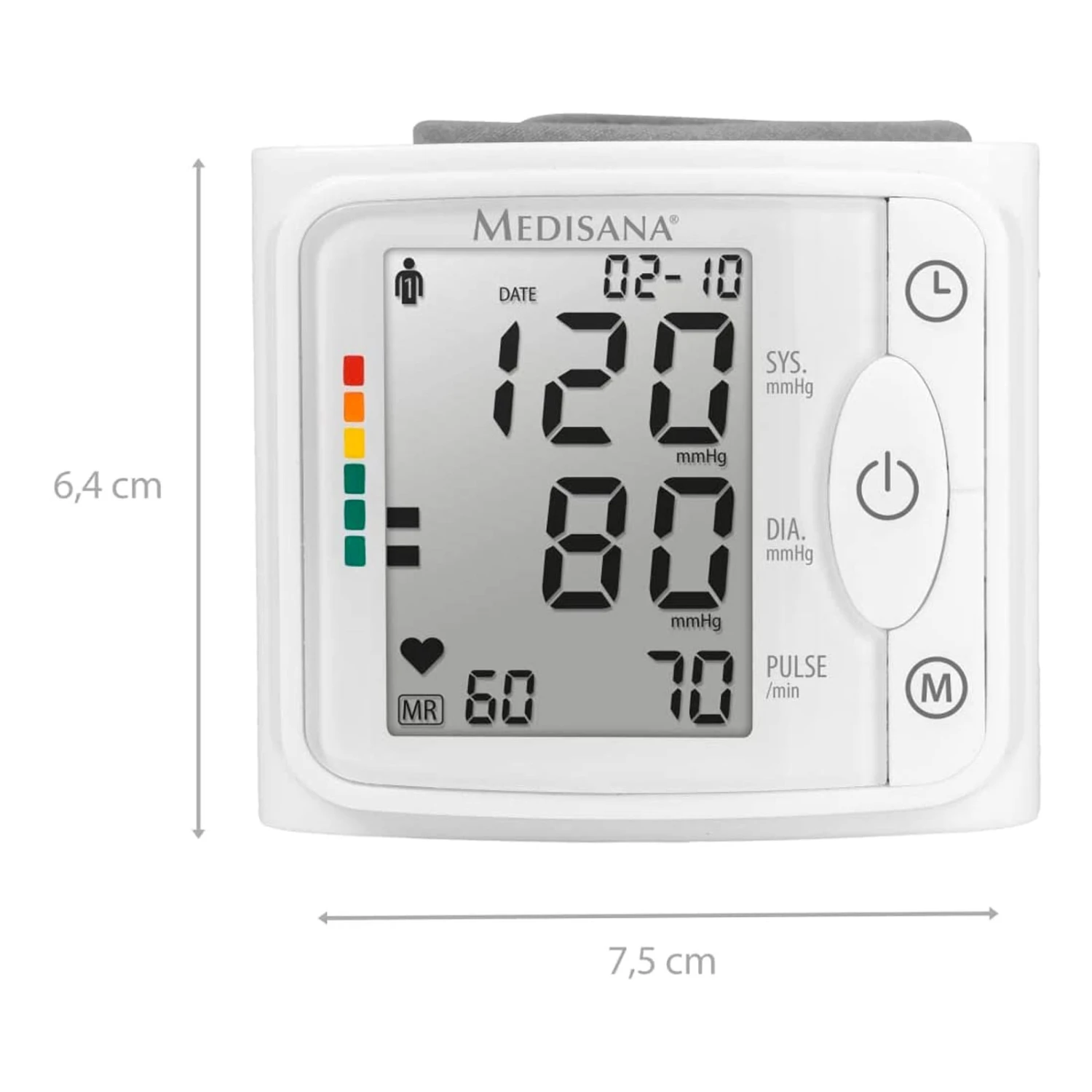 Das Handgelenk-Blutdruckmessgerät BW 320 von medisana steht für präzise Blutdruckmessung am Handgelenk. Als zertifiziertes Medizinprodukt ist es ein verlässliches Hilfsmittel zur regelmäßigen Blutdruckkontrolle für zu Hause. Die Einstufung der Messwerte erfolgt durch die intuitiv verständliche Ampel-Farbskala. 120 Speicherplätze für zwei Benutzer, eine Batteriestandsanzeige sowie die extra große Handgelenksmanschette machen das Handgelenk-Blutdruckmessgerät BW 320 zu einem hilfreichen Begleiter. Als zertifiziertes Medizinprodukt steht das Handgelenk-Blutdruckmessgerät BW 320 von medisana für präzise Blutdruckmessung am Handgelenk. Seine übersichtliche Displayanzeige zeigt neben Systole, Diastole und Puls auch das aktuelle Datum und die Uhrzeit an. Besonders praktisch ist, dass das Handgelenk-Blutdruckmessgerät BW 320 den Durchschnittswert der letzten drei gespeicherten Werte berechnet. Das medisana Handgelenk-Blutdruckmessgerät BW 320 ist mit einer Anzeige von unregelmäßigem Herzschlag ausgestattet, so dass Sie gleich auf den ersten Blick über Unregelmäßigkeiten informiert sind. Die Einstufung der Messwerte erfolgt durch die intuitiv verständliche Ampel-Farbskala. Besonders praktisch – nicht nur für ältere Menschen – ist das große, leicht ablesbare Display, das optimale Lesbarkeit garantiert. Über 120 Speicherplätze für zwei Benutzer verfügt das Handgelenk-Blutdruckmessgerät BW 320. Seine extra große Handgelenksmanschette ermöglicht es, das Blutdruckmessgerät bei einem Handgelenkumfang von 12,5 bis 21,5 Zentimeter anwenden zu können. Die praktische Batteriestandsanzeige hält Sie stets aktuell über den Status Ihres Geräts informiert.