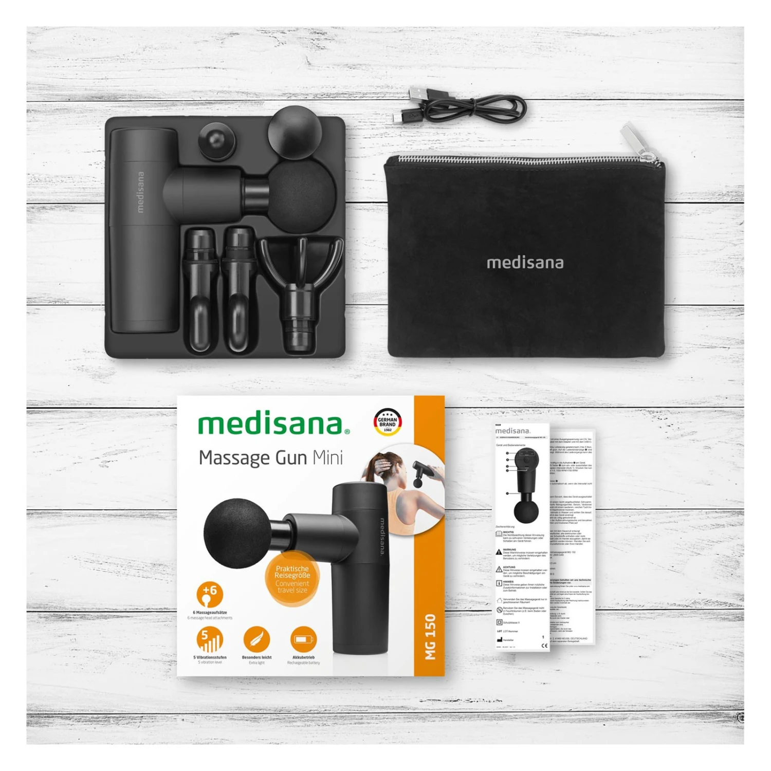 - 6 Massageaufsätze: Flat, Round, Bullet, Spinal, Finger, Palm