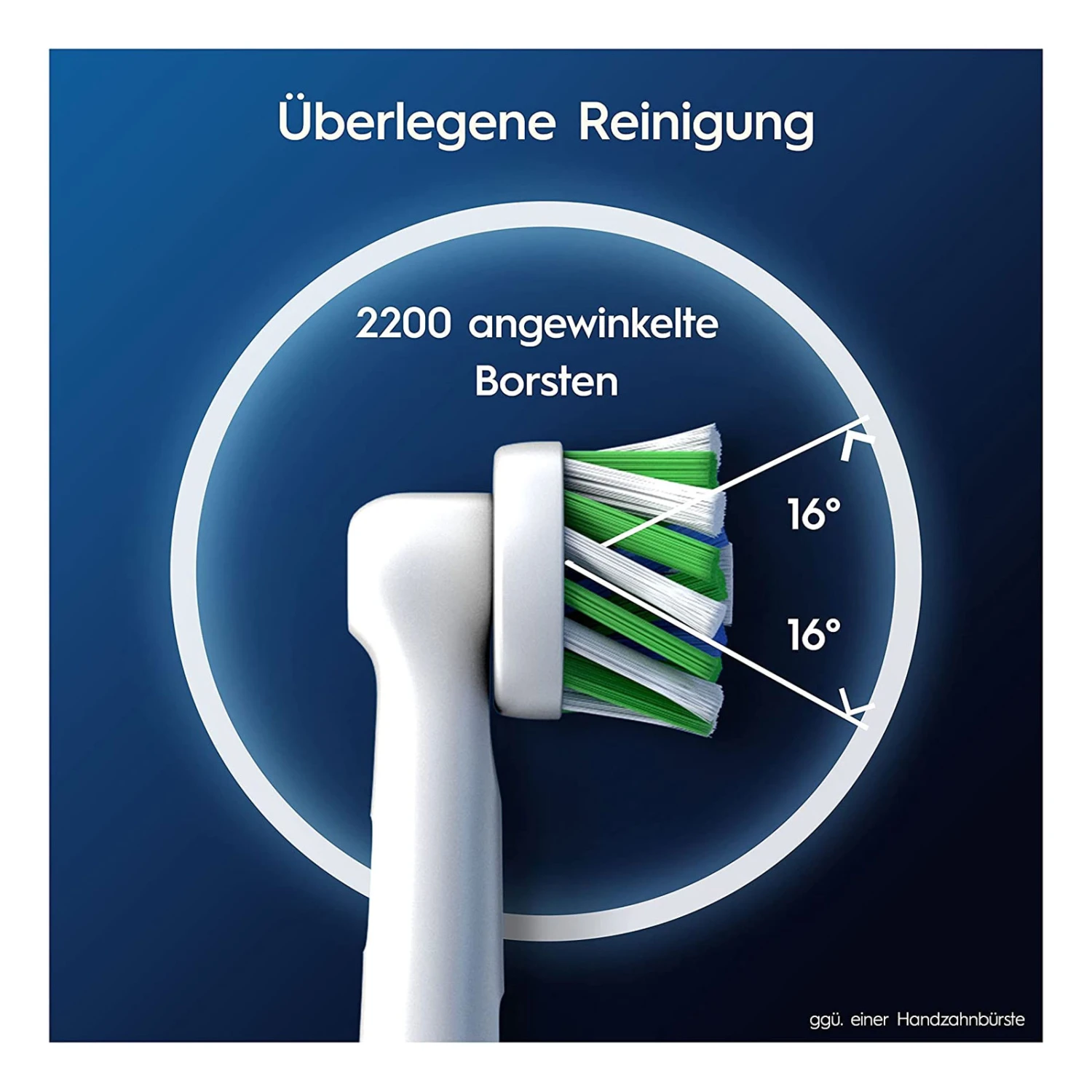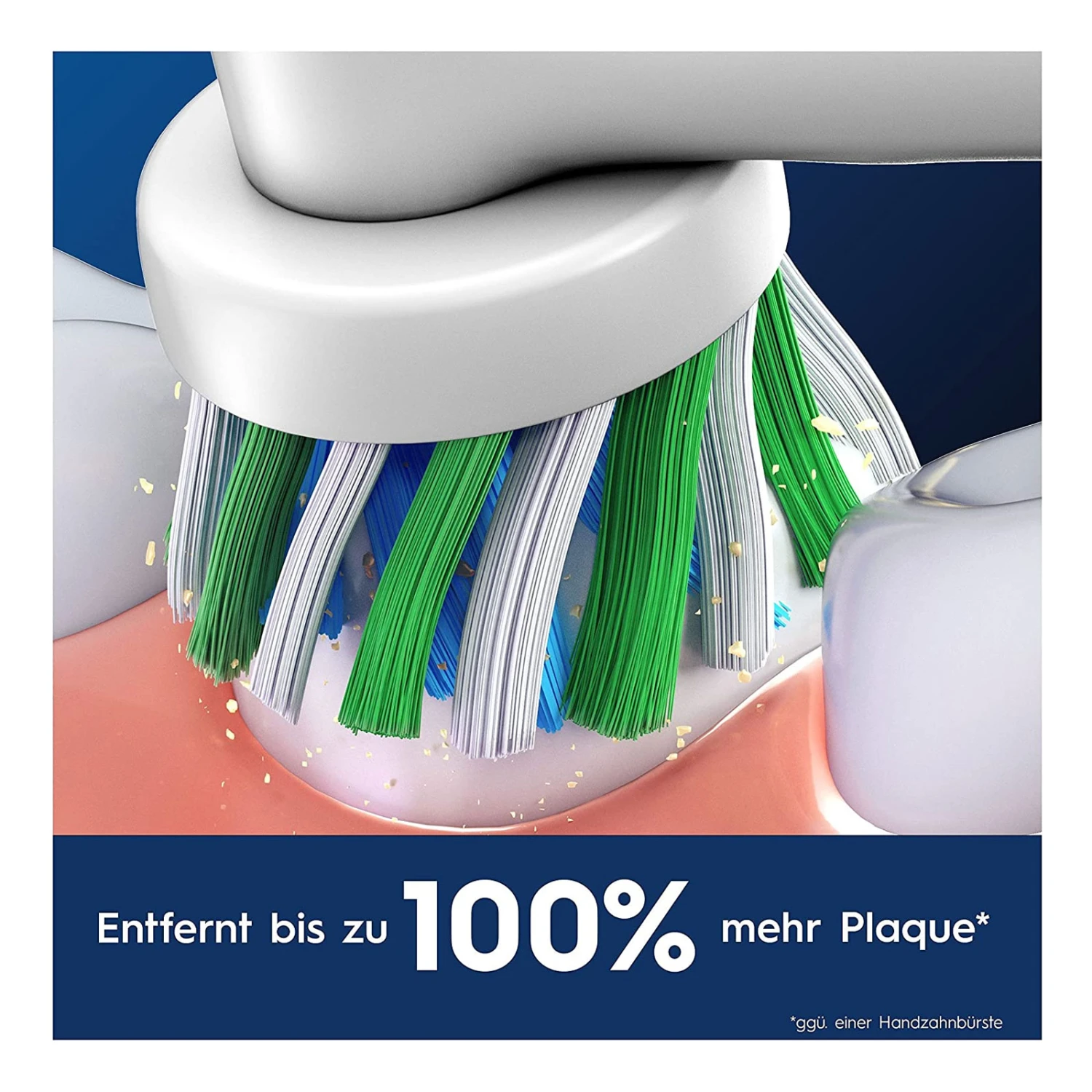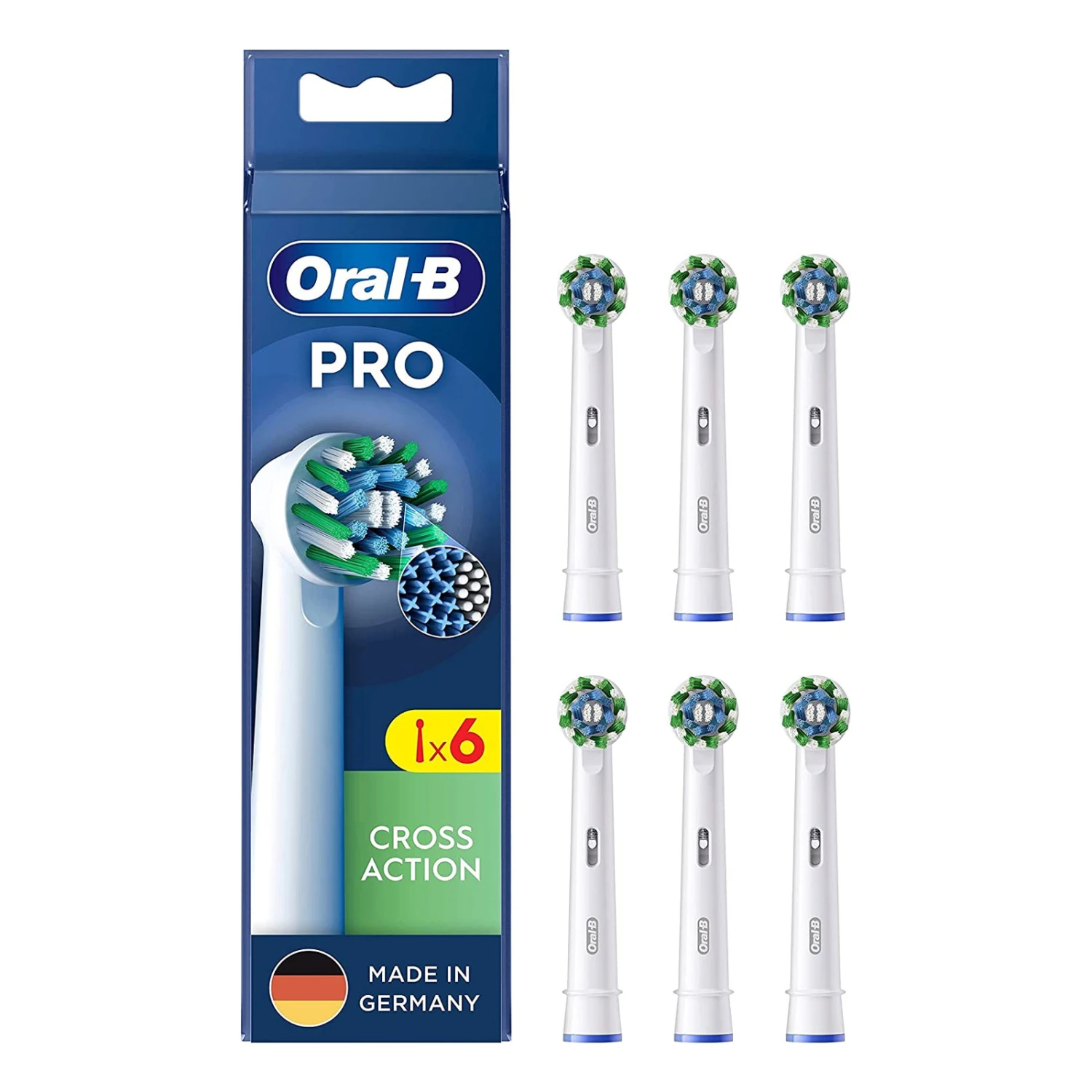 Der Oral-B Pro CrossAction Bürstenkopf verfügt über mehr als 2200 perfekt angewinkelte Borsten, die bis zu 100% mehr bakterielle Plaque entfernen als eine Handzahnbürste – für sauberere Zähne und gesünderes Zahnfleisch. Die Original-Bürstenköpfe von Oral-B wurden mit neuen X-förmigen Borsten entwickelt, die nun auch die Stellen reinigen, die normale Borsten nicht erreichen können. Die grünen Indikator-Borsten färben sich mit der Zeit je nach individueller Nutzung gelb und zeigen damit den optimalen Zeitpunkt zum Wechseln der Aufsteckbürste an – für 100% Putzkraft. Garantierte Passform mit allen wiederaufladbaren Zahnbürsten von Oral-B, außer Pulsonic und iO.