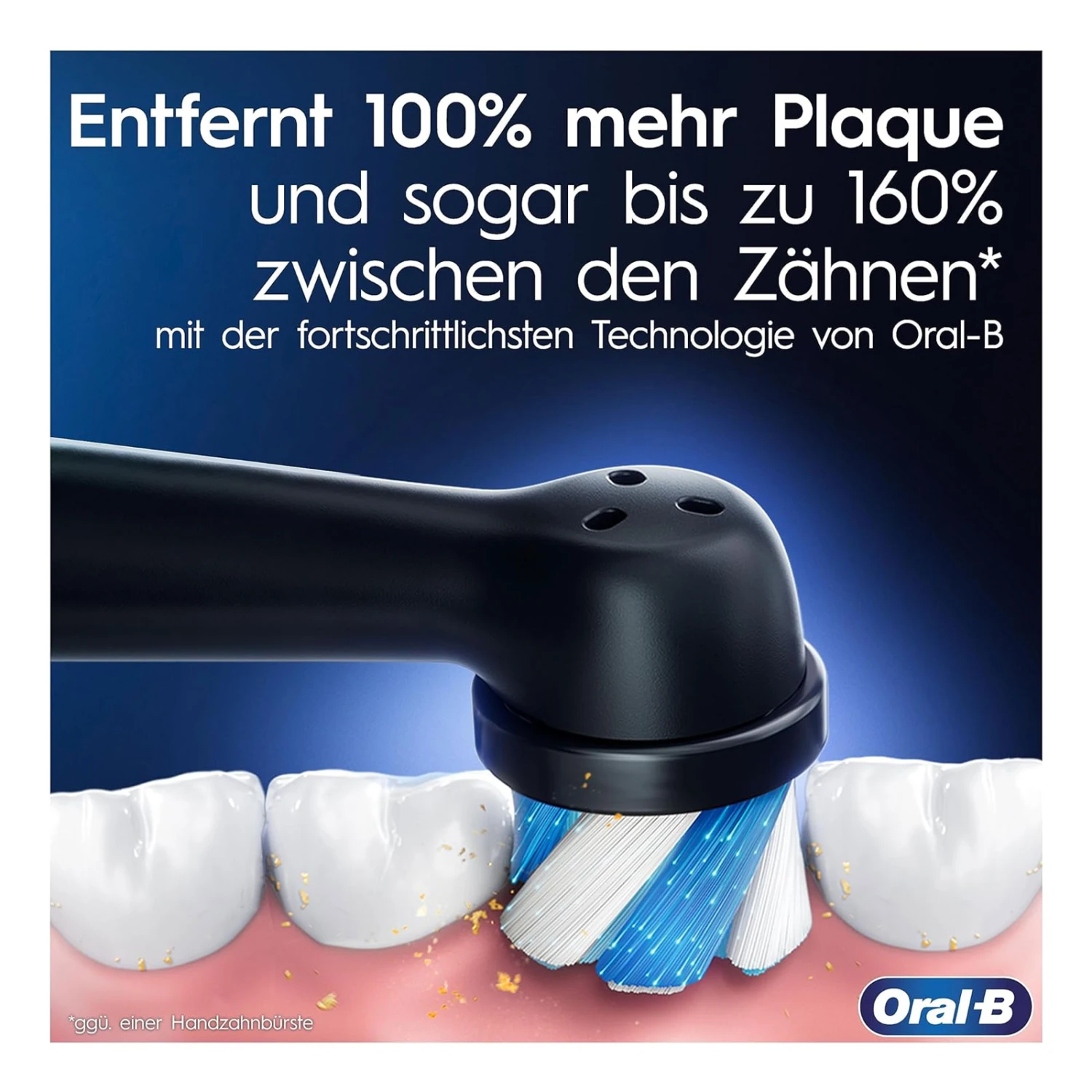 | Für ein überraschend angenehmes und leises Zahnputzerlebnis Die fortschrittlichste Technologie von Oral-B entfernt 100% mehr Plaque und sogar 160% zwischen den Zähne. Für gesündere Zahnfleisch ggü. einer Handzahnbürste |