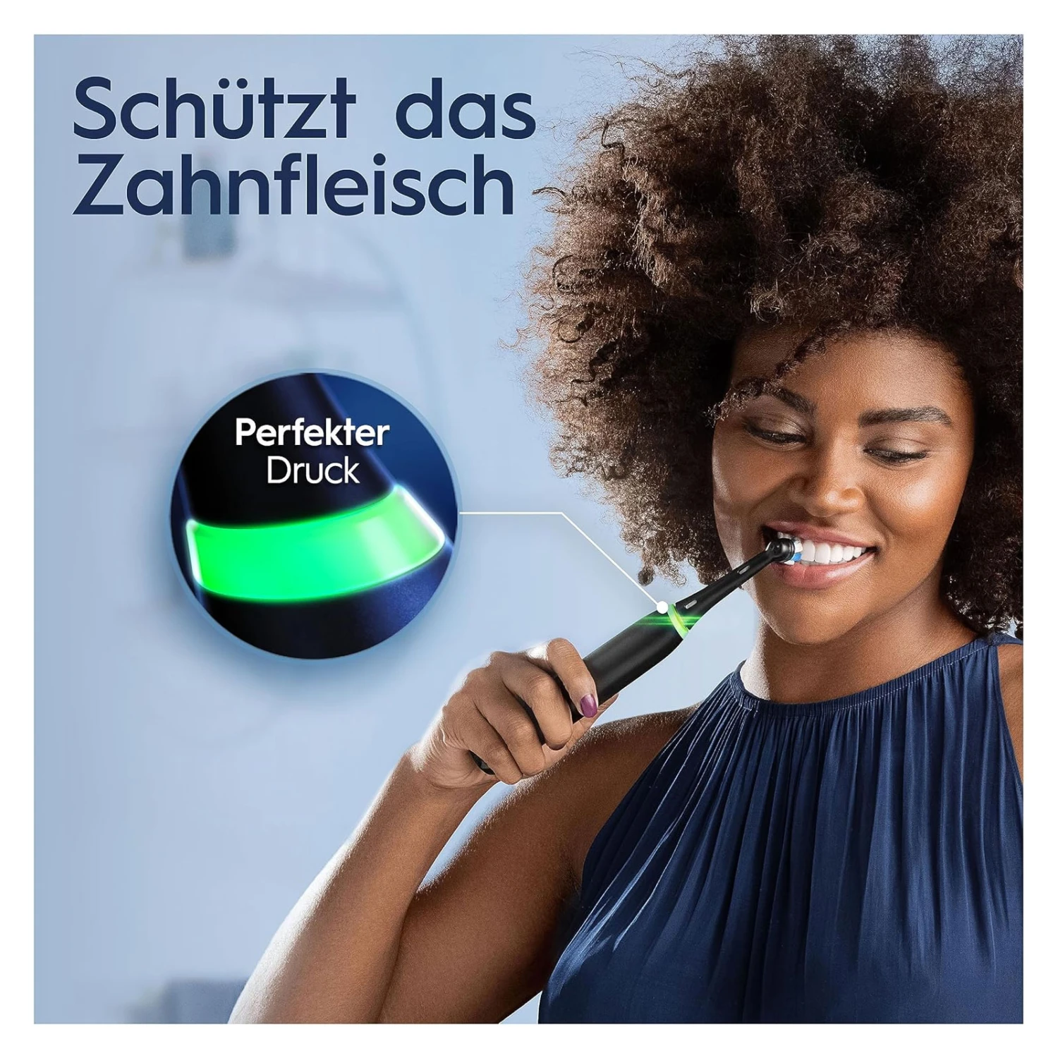 | Zahnfleischschutz Schützt das Zahnfleisch mit der iO Andruckkontrolle – die Einzige von Oral-B, die mit grünem Licht den perfekten Druck für eine effektive und sanfte Reinigung anzeigt |
