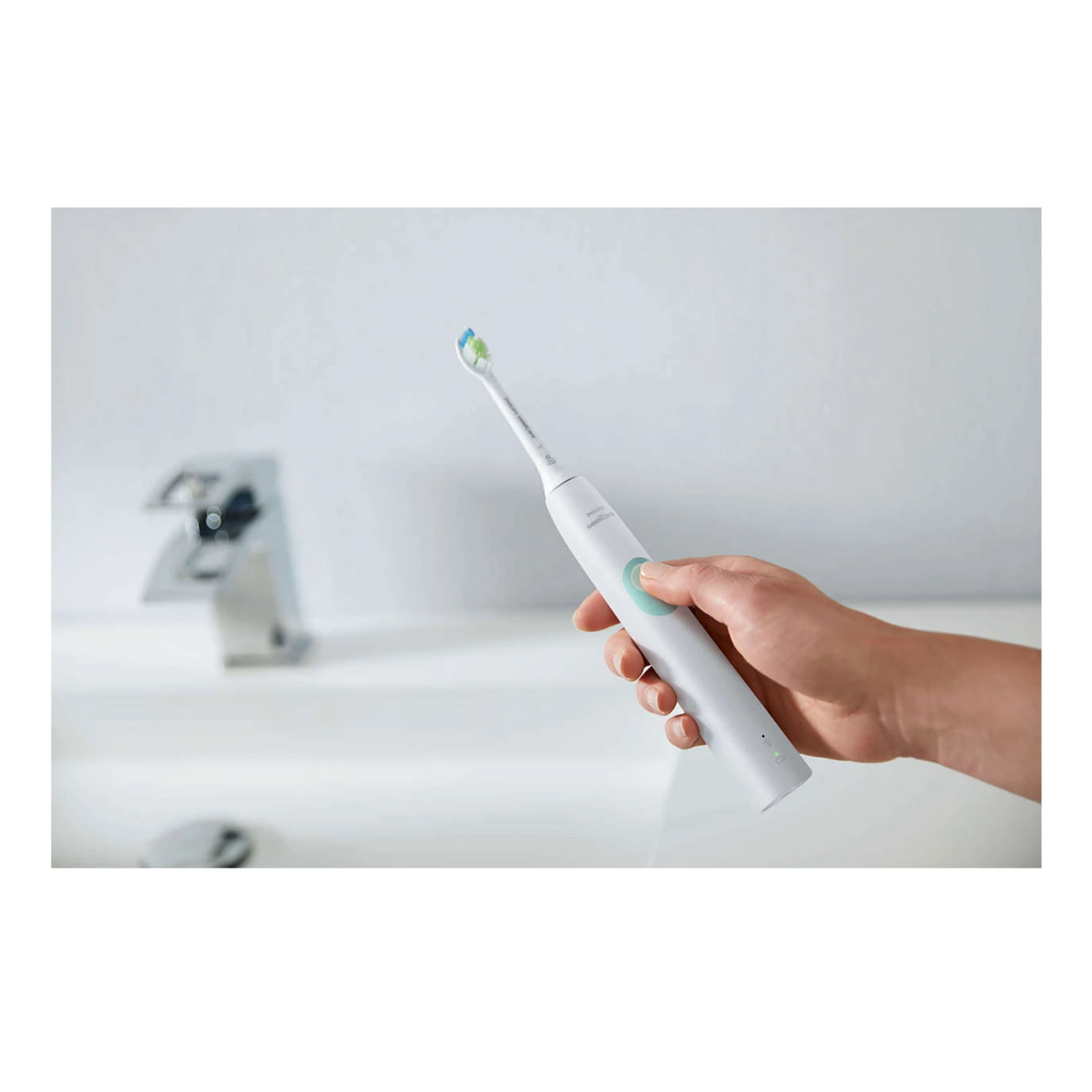 Dynamische Flüssigkeitsströmung unterstützt die Reinigungsleistung der Borsten in den Zahnzwischenräumen Der Sonicare Bürstenkopf und das Handstück sind das perfekte Team. Gemeinsam verstärken sie unsere Schalltechnologie für eine hervorragende Reinigung. Hochgeschwindigkeitsvibrationen im Handstück ermöglichen 62.000 Bürstenkopfbewegungen pro Minute, wodurch die Zahnpasta zu einer sanften mit Sauerstoff angereicherten Flüssigkeit vermischt wird, die durch die Zahnzwischenräume gepresst und entlang des Zahnfleischrands gespült wird. | |