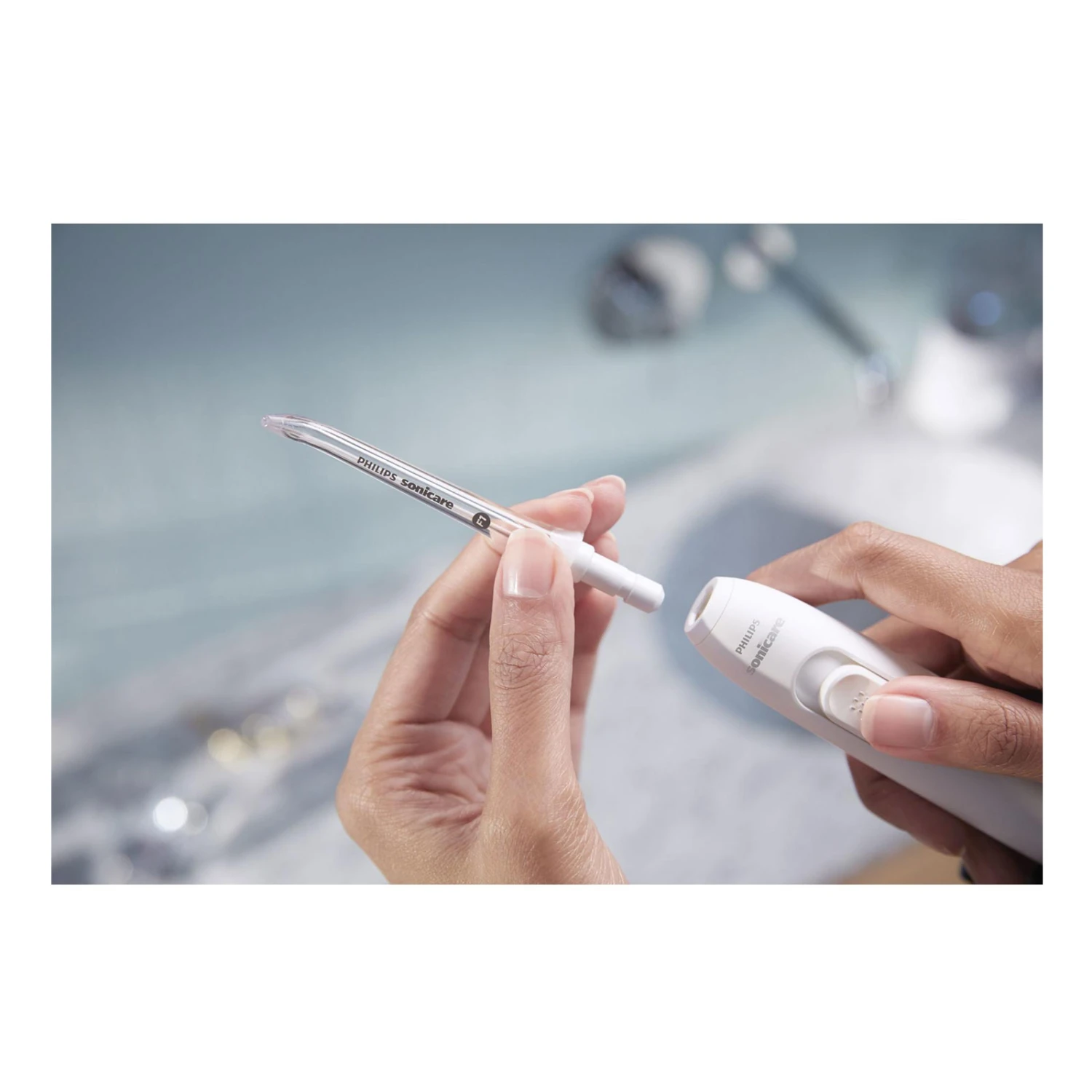 Verwenden Sie die Standarddüse für eine regelmäßige Reinigung. Dabei kommt ein einziger Wasserstrahl zum Einsatz, um Ablagerungen zu entfernen und gründlich zwischen den Zähnen zu reinigen.Die schlanke angewinkelte Düse und die Führungsspitze erleichtern die richtige Platzierung. Positionieren Sie die Düsenspitze direkt über dem Zahnfleisch, drücken Sie die Düsenspitze sanft an, sodass Kontakt mit Zahnfleisch und den Zähnen besteht, und schieben Sie sie von einem Zahn zum nächsten.