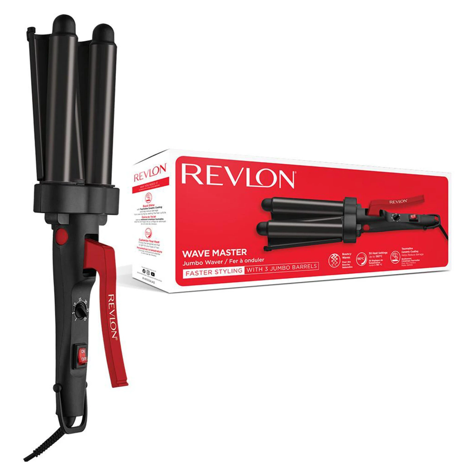 Revlon Wave Master Jumbo-Welleneisen: Trauen Sie sich etwas zu mit Revlon Hair Tools und machen Sie etwas völlig Neues aus Ihren Haaren. Wir präsentieren das Revlon Wave Master Jumbo-Welleneisen. Die einzigartige, extrabreite Mittelplatte erzeugt sanfte, glatte Wellen wie aus dem Friseursalon, die vom frühen Morgen bis zum späten Abend einfach gut aussehen. Drei Jumbo-Platten sorgen dafür, dass Sie große Teile Ihrer Haare schnell und einfach stylen können, sodass Sie einen natürlichen Look mit Mermaid-Wellen erreichen. Flexible Temperatureinstellungen: 30 Einstellungen für flexible Stylingleistung zur inliiduellen Anpassung der Wärme an alle Haarbedürfnisse. Turmalin-Keramikbeschichtung: Verstärkt den Glanz und reduziert Schäden der Haarkutikula durch Über-Styling. Kühle Spitze für einfaches Styling, Sperrring zur einfachen Aufbewahrung. Kabel mit Drehgelenk, das Kabelgewirr verhindert für einfaches Styling und Bewegungsfreiheit. Dual-Stecker für GB/EU – ideal für Reisen.
